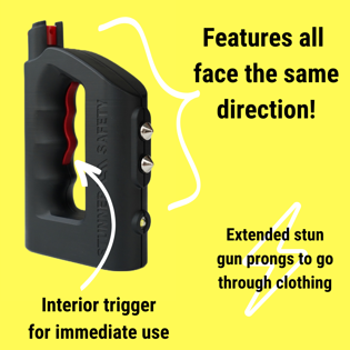 Our flagship product is the Stunner; a 3-in-1 self-defense tool combining a stun gun, pepper spray, and flashlight. This less-lethal device can be used for both long-distance and short-distance self-defense, also known as two-tiered defense. It’s lightweight (20 ounces), has a wrist strap attachment, and fits into larger pockets!