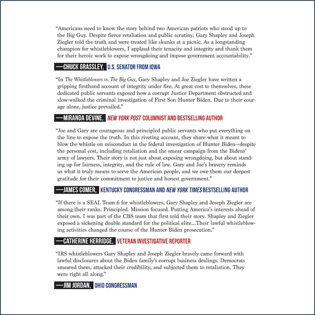 In this gripping account, IRS Special Agents turned whistleblowers, Gary Shapley and Joe Ziegler, exposed the shocking truth behind their investigation into the Biden Family - and the powerful forces that tried to stop them.